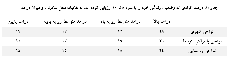به طور متوسط، درصد افرادی که در شهرها، نمره ای بین 8 تا 10 به وضعیت زندگی خود دادند، 2 تا 4 درصد نسبت به نواحی روستایی بیشتر است. بنابراین شکافی بین شهرها و روستاها ازحیث میزان رضایت از زندگی و شادکامی وجود دارد. همچنین میزان شادکامی و رضایت از زندگی افرادی که در نواحی با تراکم متوسط (نواحی که 5000 نفر جمعیت و تراکم 300 نفر در کیلومتر مربع دارند) زندگی می کنند، از نواحی شهری کمتر و از نواحی روستایی بیشتر است. نتایج به تفکیک محل سکونت و میزان درآمد در جدول شماره یک آمده است.