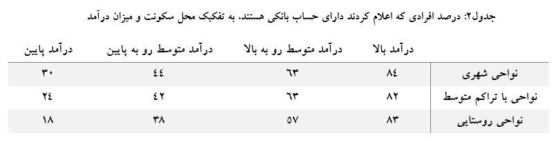افراد ساکن در شهرها دسترسی بیشتری به منابع مالی، توانایی تهیه خوراک و غذا و نیز حمایت های اجتماعی نسبت به سایر نواحی دارند. برای مثال طبق گزارش موسسه گالوپ و تقسیم بندی درآمدی بانک جهانی، 84 درصد از افراد با درآمد بالا، 63 درصد از افراد با درآمد متوسط رو به بالا، 44 درصد از افراد با درآمد متوسط رو به پایین و 30 درصد افراد با درآمد پایین در نواحی شهری دارای حساب بانکی هستند. این آمار برای افراد ساکن در نواحی روستایی با درآمد بالا 83 درصد، با درآمد متوسط رو به بالا 57 درصد، با درآمد متوسط رو به پایین 38 درصد و افراد با درآمد پایین 18 درصد است.
