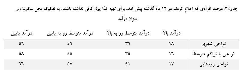 نتایج نظرسنجی گالوپ نشان می دهد، افرادی که در مناطق روستایی و با درآمد پایین و متوسط زندگی می کنند نسبت به نواحی شهری بیشتر گزارش کرده اند که در 12 ماه گذشته اتفاق افتاده است که برای تهیه غذا پول کافی نداشته باشند. هر چه میزان شهرنشینی و میزان درآمد افزایش پیدا می کند، افراد کمتر برای تهیه غذا با مشکل مواجه شده اند. نتایج نظرسنجی به تفکیک نواحی و میزان درآمد در جدول شماره 3 آمده است.