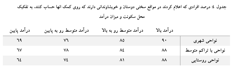 افراد ساکن در شهرها نسبت به افراد ساکن در روستاها از حمایت اجتماعی بیشتری برخوردارند. نتایج نظرسنجی گالوپ نشان می دهد، 62 درصد از افراد ساکن در روستاها اعلام کردند در مواقع سختی و مشکلات دوستان و خویشاوندانی دارند که بتوانند بر روی کمک آنها حساب کنند. این رقم در نواحی شهری 69 درصد است. نتایج به تفکیک محل سکونت و درآمد در جدول ذیل آمده است.
