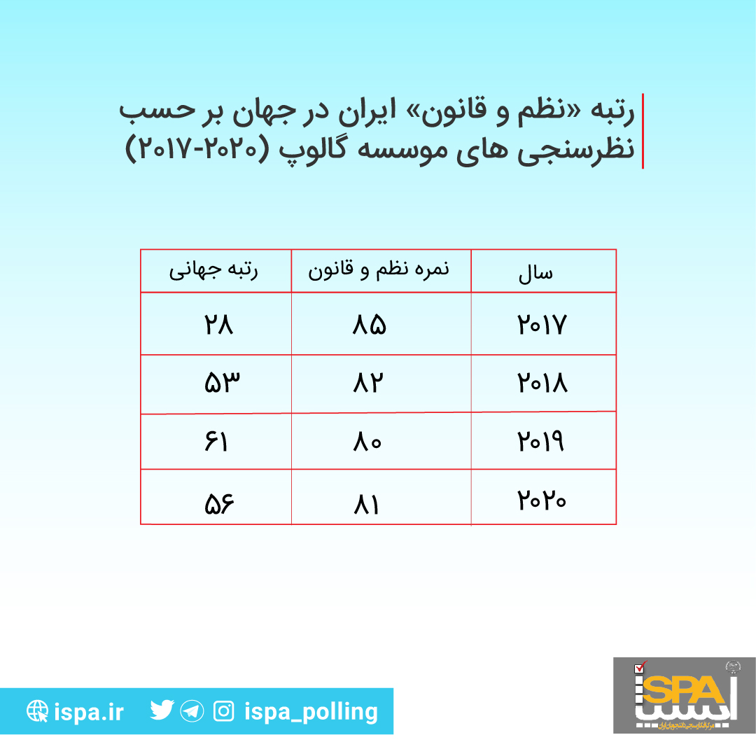 کشور ایران در گزارش 2017 شاخص نظم و قانون موسسه نظرسنجی گالوپ با نمره 85 از بین 135 کشور، رتبه 28 جهان را به خود اختصاص داده است. ایران در گزارش 2018 با نمره 82 از بین 142 کشور، در رتبه 53 و در گزارش 9 201 با نمره 80 از بین 142 کشور، در رتبه 61 جای دارد. در سال 2020 ایران با نمره 81 از بین 144 کشور رتبه 56 را کسب نموده است.