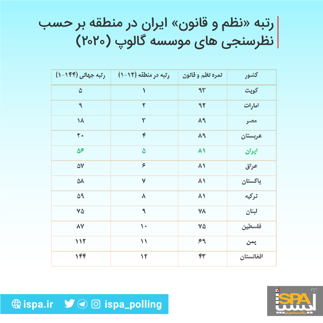 وضعیت ایران در بین کشورهای منطقه در جدول زیر آمده است. ایران با نمره 81 در بین 12 کشور منطقه رتبه 5 را در سال 2020 در شاخص نظم و قانون به خود اختصاص داده است.