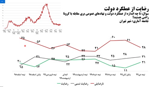 این جامعهشناس و پژوهشگر حوزه اجتماعی افزود: یکی دیگر از سوالهای تکرار شده در نظرسنجیها مربوط به عملکرد دولت و نهادهای عمومی در مدیریت کرونا بود. بیشترین میزان نارضایتی در اسفند 98 دیده میشود که به تدریج و با فراگیر شدن کرونا در سطح جهان، از میزان نارضایتی از عملکرد دولت کاسته شده است.