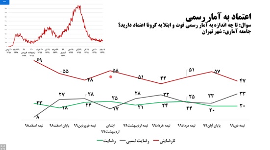 دکتر نصر اصفهانی با اشاره به اهمیت موضوع اعتماد به آمار گفت: یکی دیگر از سوالهایی که در این نظرسنجیها بارها مورد پرسش قرار گرفت، میزان اعتماد به آمارهای رسمی اعلام شده بود. نتایج این نظرسنجیها نشان میدهد، بیشترین میزان بیاعتمادی مربوط به مقطع ابتدایی شیوع همهگیری در اسفند 98 است. در این بین هرچه میزان نارضایتی از عملکرد دولت افزایش پیدا میکند، میزان بیاعتمادی به آمار رسمی نیز با افزایش روبرو میشود.