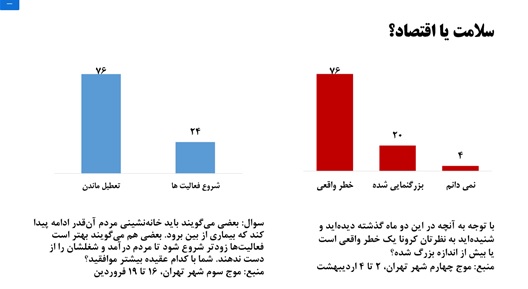 دکتر نصر اصفهانی، موضوع مهم سلامت یا اقتصاد را یکی از موضوعات مورد بحث در بسیاری از کشورهای جهان عنوان کرد و گفت: تقریباً اگر دو ماه اخیر را استثناء در نظر بگیریم، میتوان گفت که از دید افکار عمومی، بحث سلامت در اولویت قرار دارد و این موضوع را میتوان در نتایج نظرسنجیهای مختلف مشاهده کرد. به عنوان مثال، در فرودین 99 بالغ بر 76 درصد پاسخگویان، با وجود مشکلات اقتصادی همچنان موافق تعطیل ماندن برای از بین رفتن بیماری بودند. باید به این نکته اشاره کرد که حمایت افکار عمومی از اعمال محدودیتها در آن مقطع زمانی (اسفند 98) در شرایطی بود که هنوز این محدودیتها به صورت رسمی و سراسری تصویب و اجرا نشده بود.