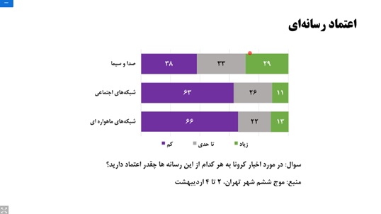 دکتر نصر اصفهانی با اشاره به بحث اعتماد رسانهای تأکید کرد: اگرچه براساس نتایج نظرسنجیها، مهمترین منبع کسب اطلاعات مردم برای اخبار کرونایی صدا و سیما با حدود 65 درصد عنوان شده است، اما این منبع بودن الزاماً به معنای اعتماد به صدا و سیما نیست؛ به عنوان مثال، براساس نتایج نظرسنجی اردیبهشت 99، میزان اعتماد (زیاد) به صدا و سیما 29% است. اگرچه نسبت به بقیه رسانهها اعتماد بیشتری به صدا و سیما وجود دارد اما در مجموع این عدد اعتماد چندان زیادی را نشان نمیدهد.