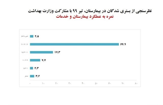 آقازاده همچنین با اشاره به نتیجه نظرسنجی با مشارکت وزارت بهداشت، درمان و آموزش پزشکی در خصوص نظر بستریشدگان از عملکرد بیمارستان و خدمات آنها گفت: 66.9% از پاسخگویان نمره 20-16 را به عملکرد بیمارستانها و خدمات آنان دادند.