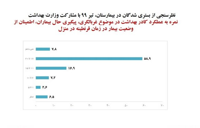 وی تأکید کرد: همچنین در موضوع غربالگری، پیگیری حال بیماران اطمینان از وضعیت بیماران قرنطینه در منزل نیز 58.9% از پاسخگویان نمره 20-16 را برای عملکرد کادر بهداشت در نظر گرفتند.